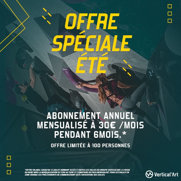 *Offre valable jusqu’au 9 juillet donnant accès à toutes les salles du groupe Vertical’Art. A l’issue du 6e mois la mensualisation se fera au tarif et conditions du pass mensualisé. Pour les salles en zone orange les prélèvements ne commenceront qu’à l’ouverture des salles.