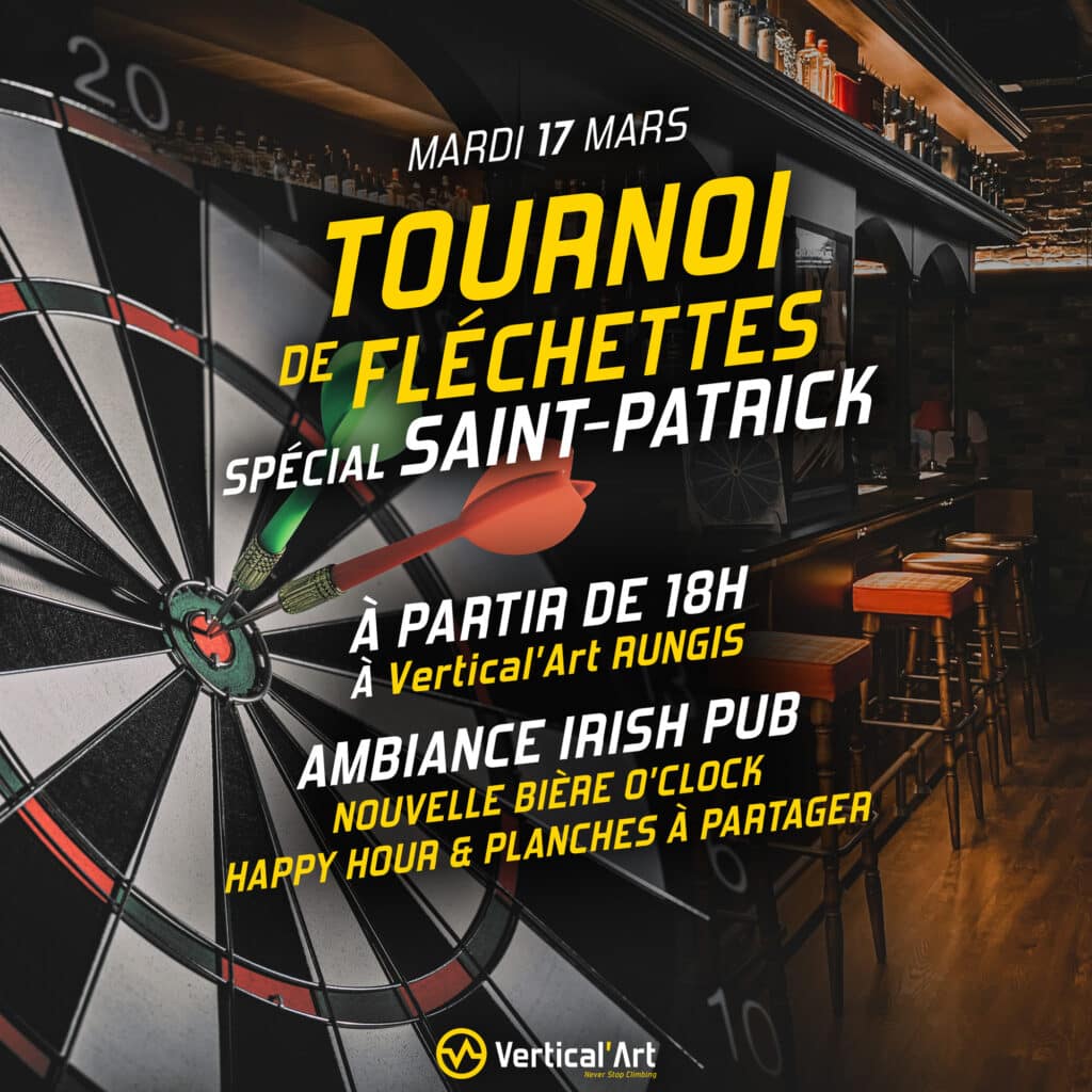 Le mardi 17 mars, Vertical’Art Rungis passe en mode Saint Patrick avec une soirée tournoi de fléchettes et une ambiance Irish Pub comme on les aime : du jeu, du bruit, des potes, et un bar qui suit le rythme.